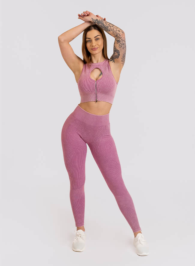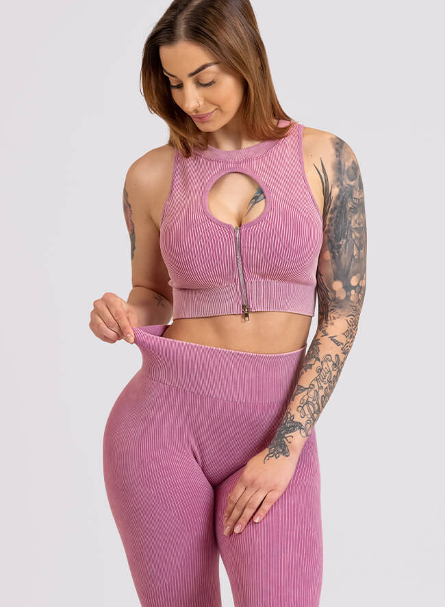 Покажете зашеметяващата си форма с този оребрен комплект, който подчертава извивките ви и извайва фигурата ви! Сутиенът има модерен елемент с изрязване и цип за лесно обличане и събличане. Този комплект е идеален за тренировка или за даване на модна заявка.